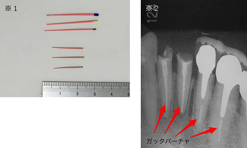 現在歯科診療においてガッタパーチャは「根管充填材料」、いわゆる歯の根の中への詰め物として使われています。(※1画像参照)